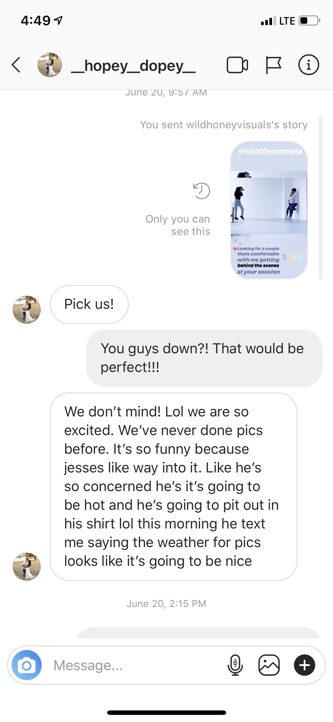Later that week I received a very unexpected phone call. It was her boyfriend Jesse! He was calling to let me in on a pretty big secret. Keep in mind at this point we had never met before. But he went on to tell me all about how he met Hope and their first date at Basket Slough. I could already tell how crazy he was about this girl from how highly he spoke of her.